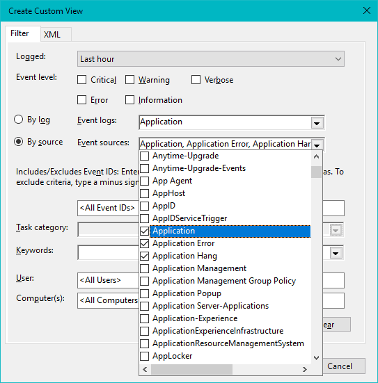 Step 4: Under the Event level section, ensure that Error and Warning are checked. Then, choose the By source option. In the Event sources list, scroll through and check the boxes next to Application, Application Error, and Application Hang.