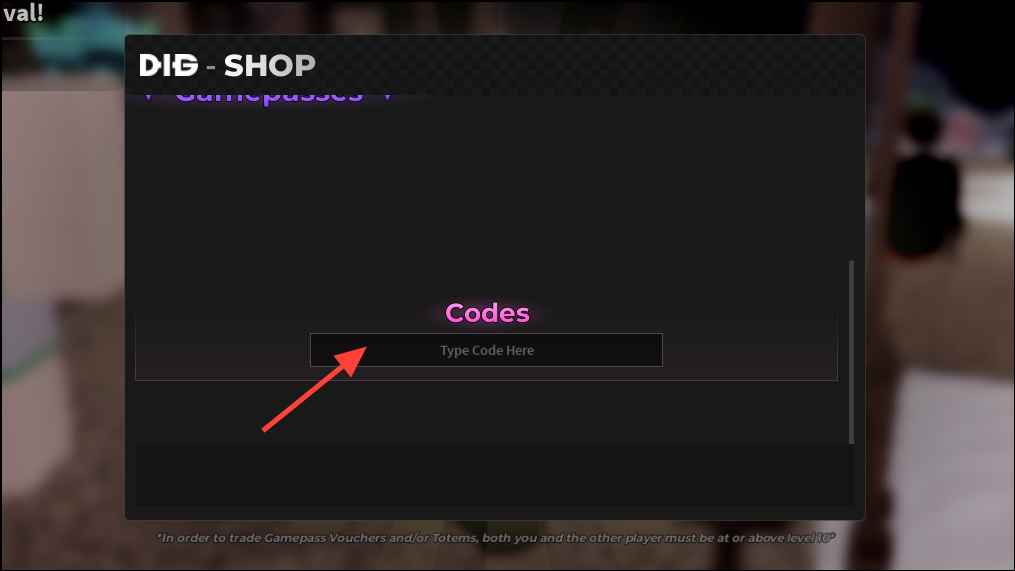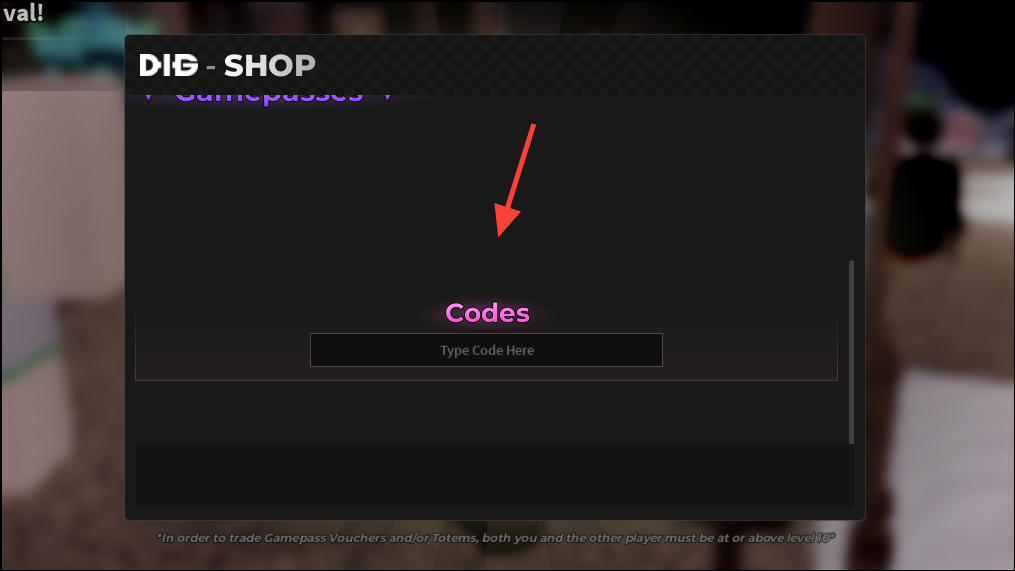 Step 3: Scroll to the bottom of the Shop until you see the Codes input box.