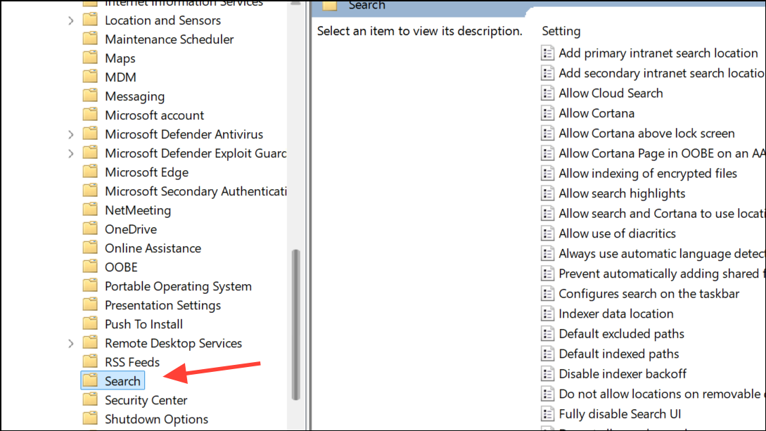 Step 2: In the left pane, navigate to Computer Configuration > Administrative Templates > Windows Components > Search. This folder contains search-related policies.