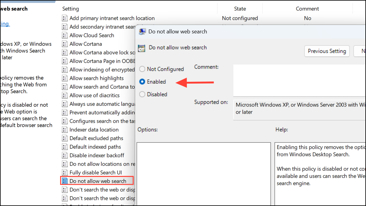Step 3: Double-click Do not allow web search and set it to Enabled. This disables web search integration in the Start Menu.