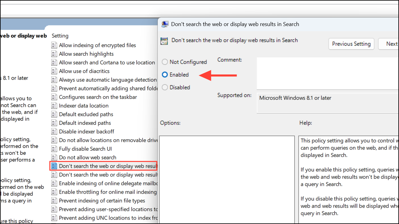 Step 4: Double-click Don't search the web or display web results in Search and set it to Enabled. This further restricts AI-powered web results.