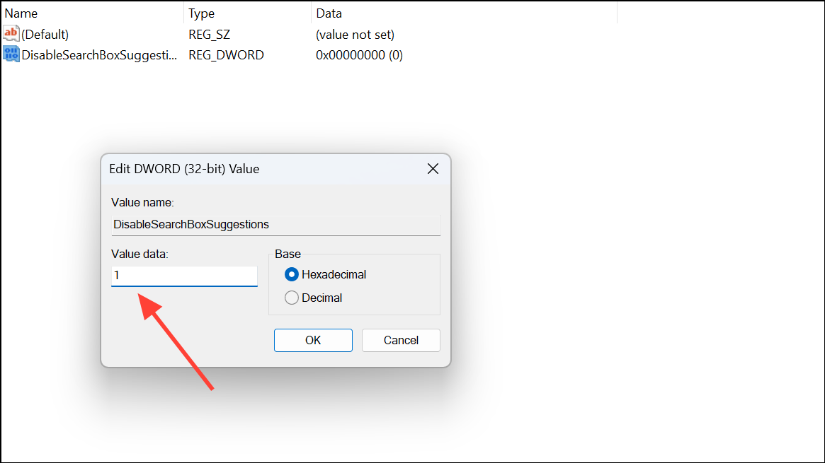 Step 4: Double-click DisableSearchBoxSuggestions and set its value to 1. This disables AI-based suggestions and web results in the Start Menu search box.