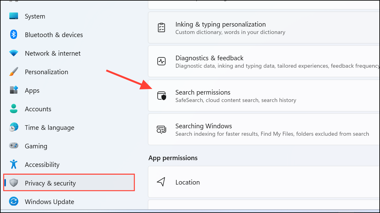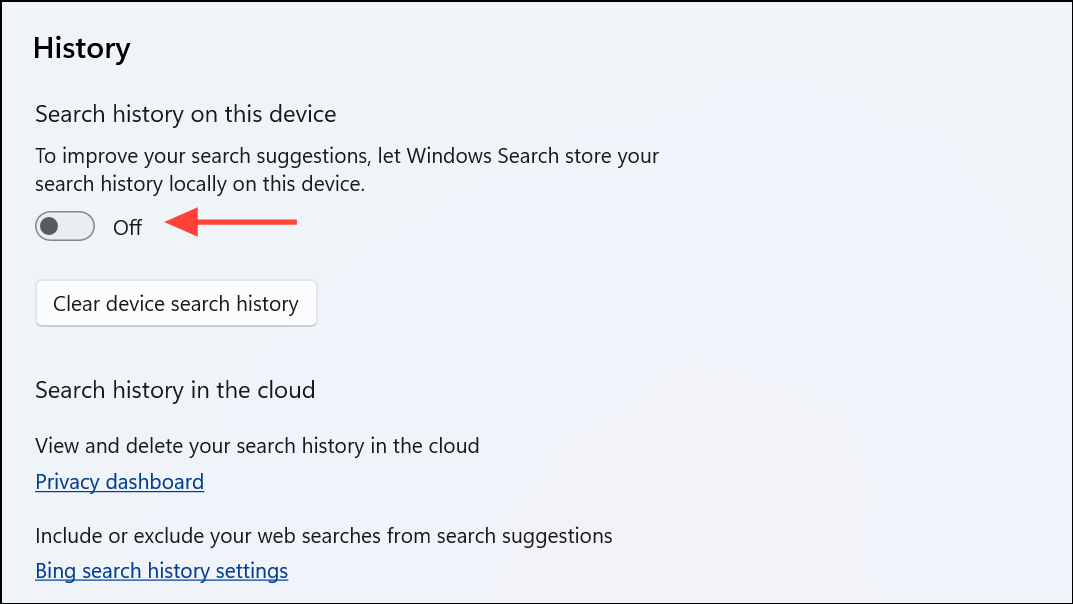 Step 4: Scroll to History and disable Search history on this device to stop Windows from using past searches to generate suggestions.
