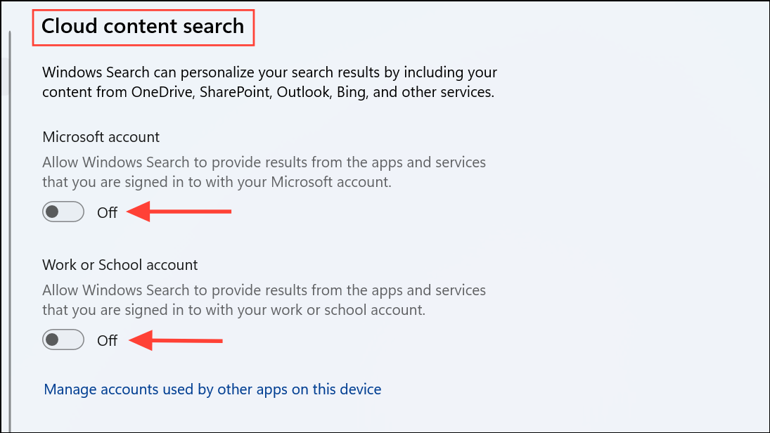 Step 3: In the Cloud content search section, turn off the toggles for Microsoft account and Work or school account. This prevents AI from using your cloud content for search suggestions.