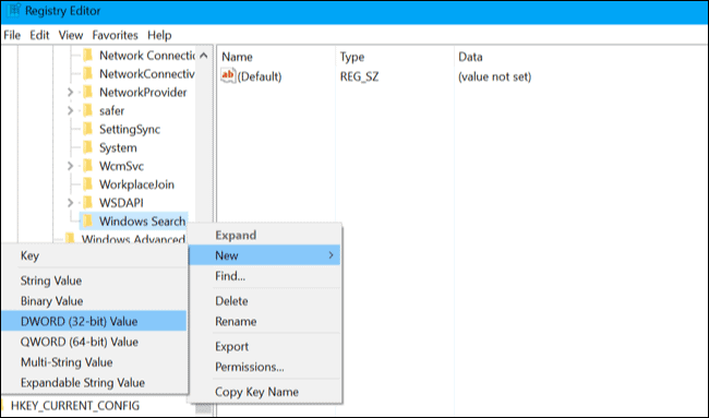- Right-click on the Windows Search folder located in the left pane » select New » select DWORD (32-bit) Value.