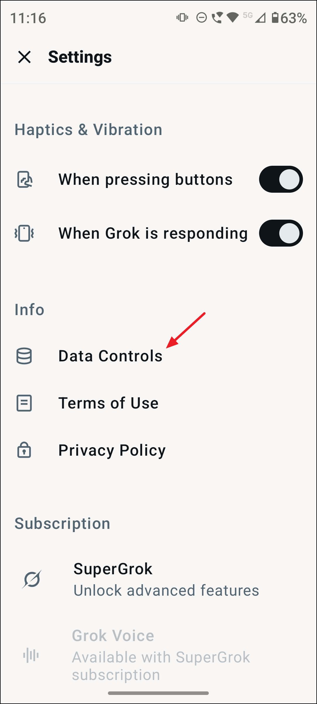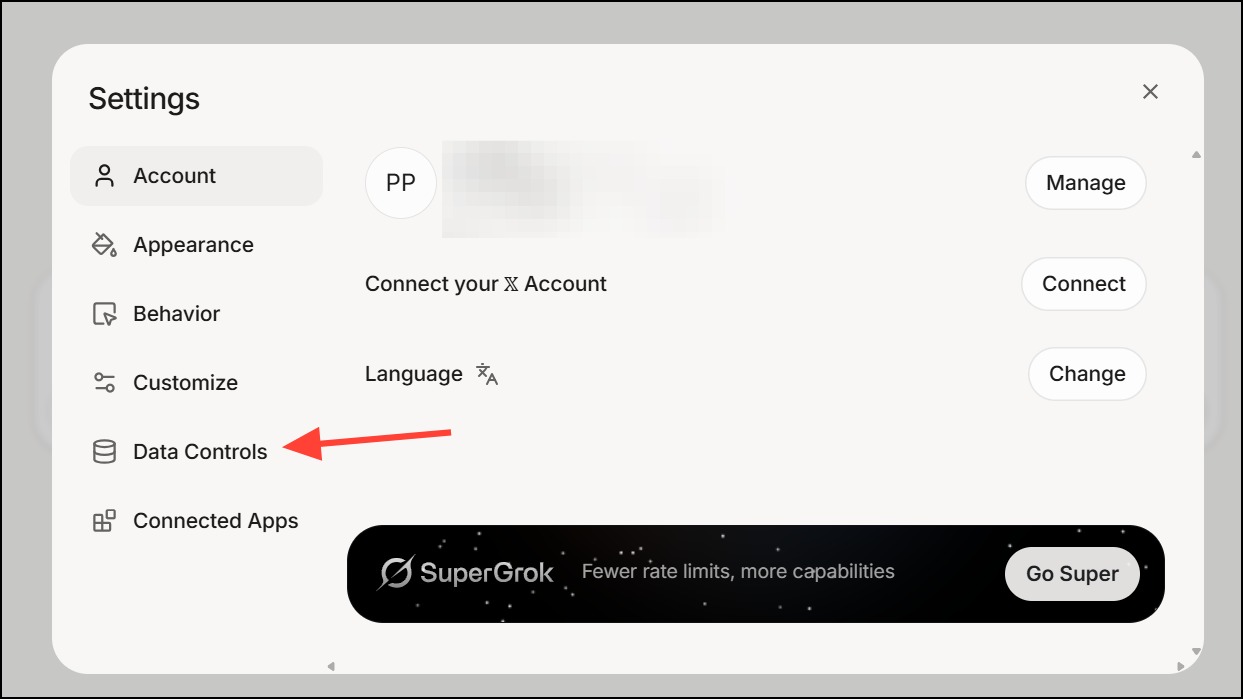 Step 4: Within Settings, find and click on the Data Controls section. This area manages how Grok handles your data and conversation history.