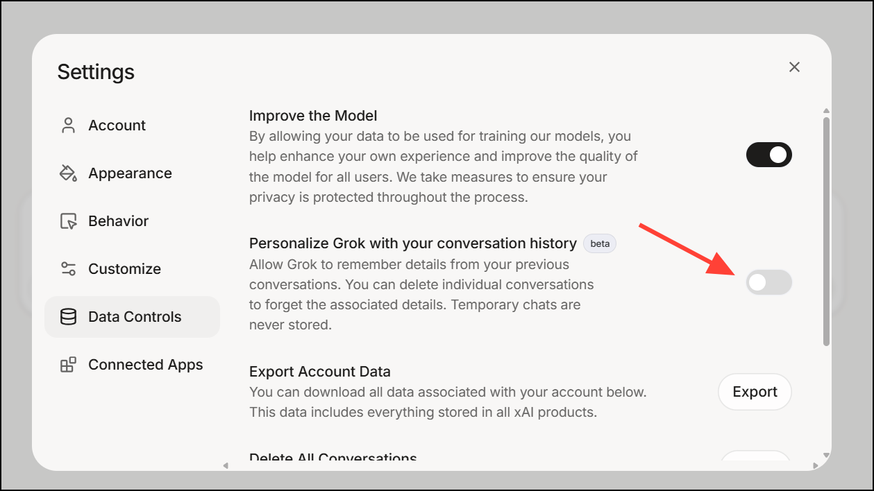 Step 5: Locate the option labeled Personalize Grok with your conversation history (or a similarly worded setting). Toggle this option off to disable the memory feature, preventing Grok from storing and using your past conversations to personalize responses.