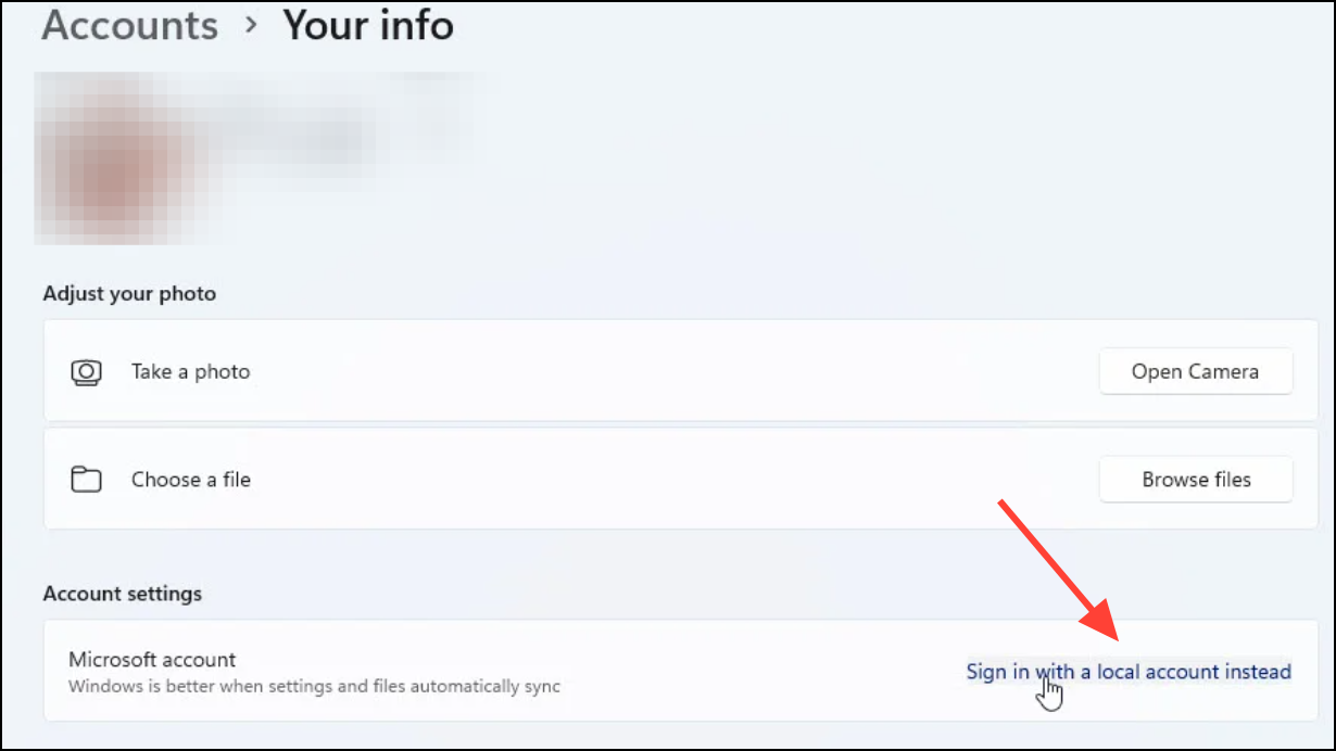 Step 1: Go to Settings > Accounts > Your info. Click Sign in with a local account instead.