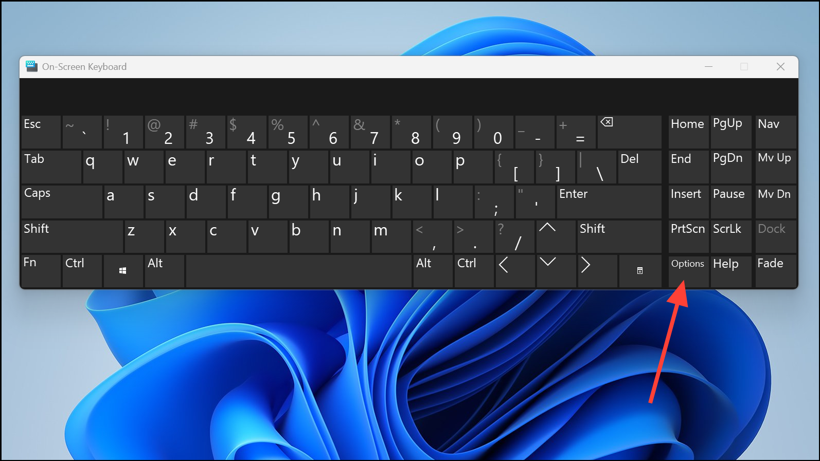 Step 2: On the on-screen keyboard window, locate and click the Options button in the bottom-right corner. This opens a configuration menu with features specific to the virtual keyboard.