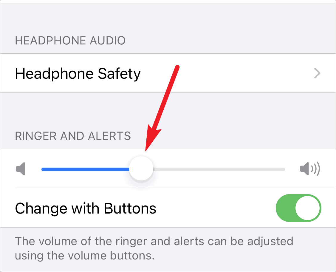 Then, under ‘Ringer and Alerts’, make sure that the slider is at an appropriate value. If you have the ‘Change with Buttons’ option on, you can also adjust your Ringer volume from the side buttons.