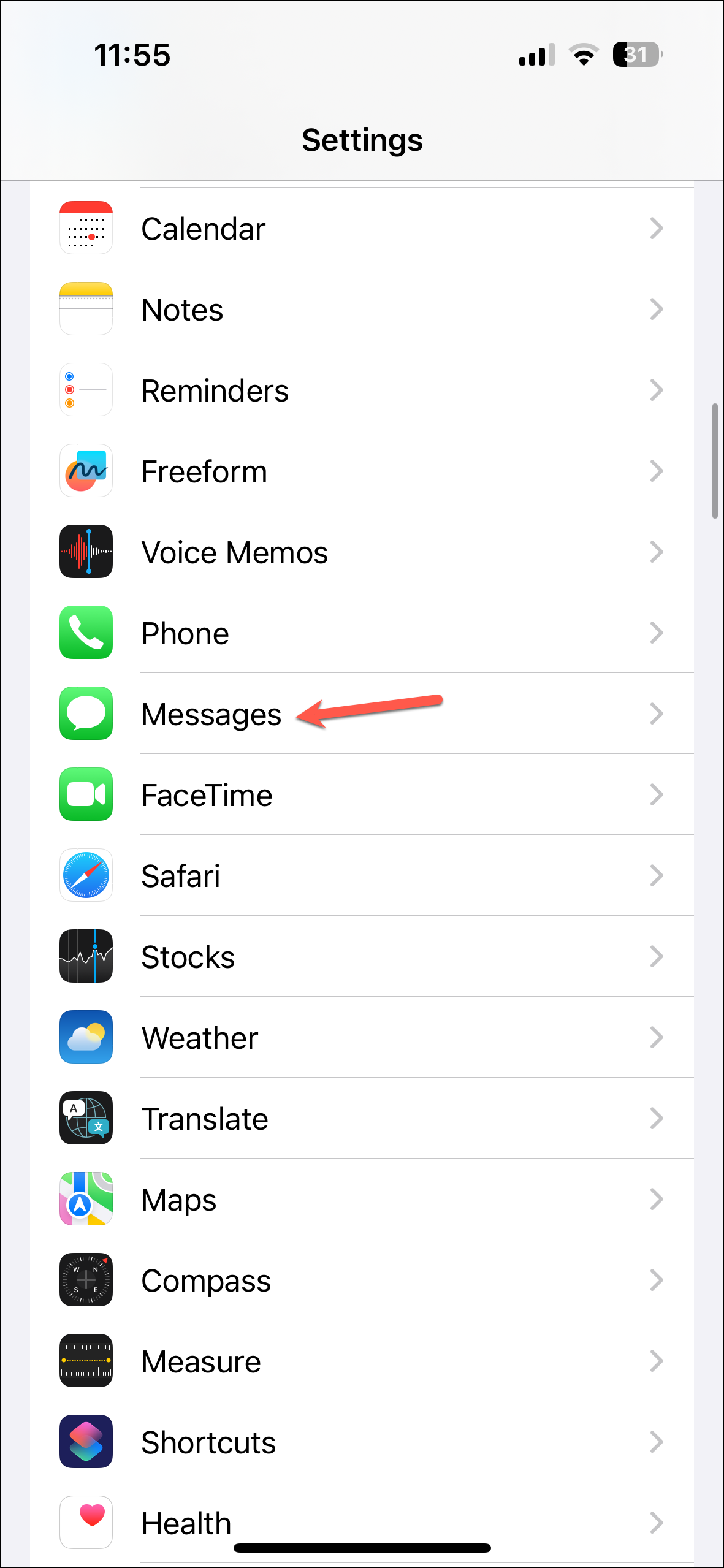 - Scroll down and navigate to 'Messages'.