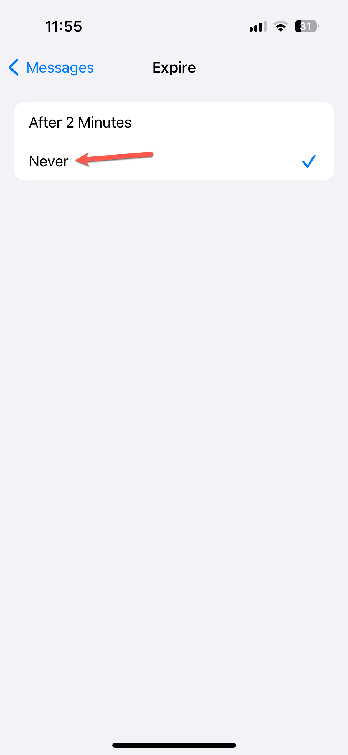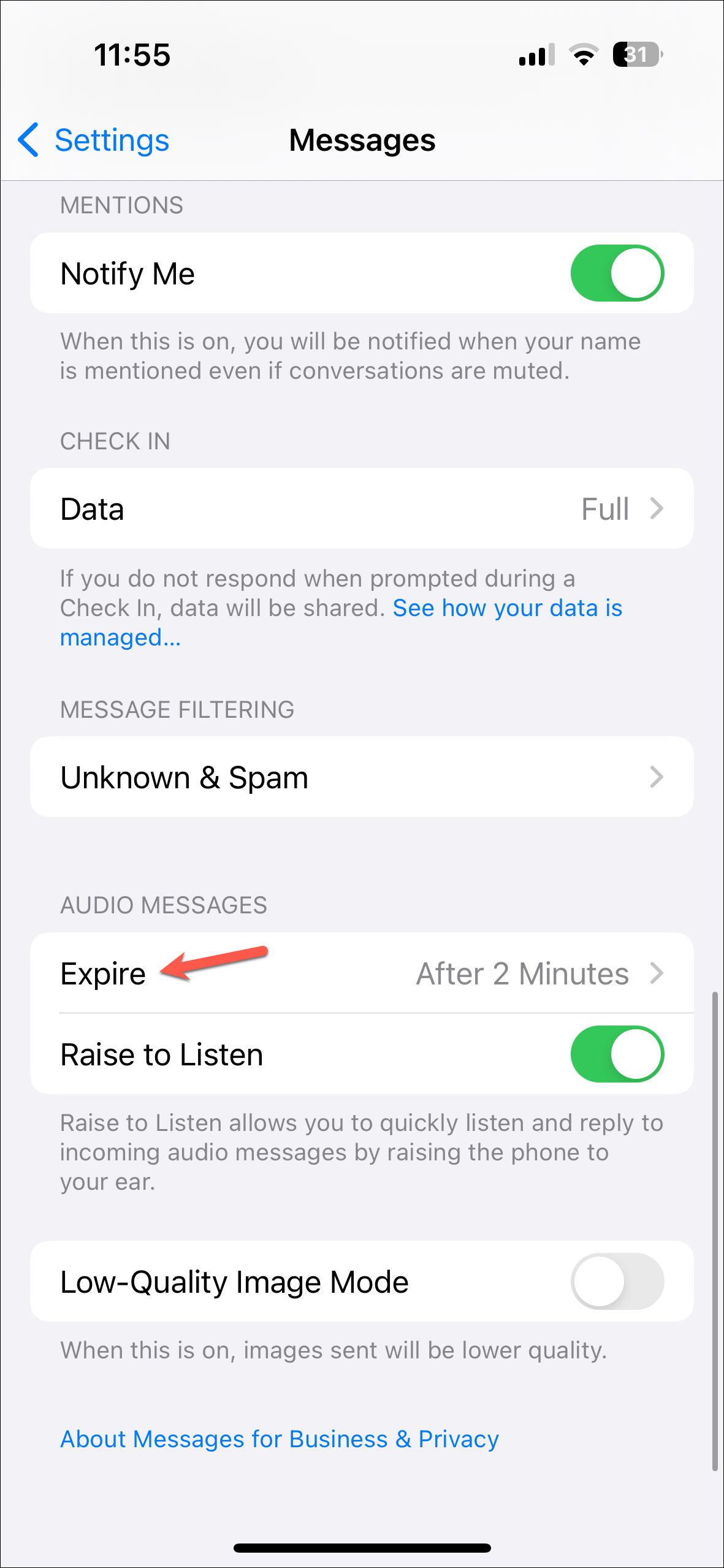 - Again, scroll down in the Messages settings and go to the 'Audio Messages' section. Tap on the 'Expire' option.