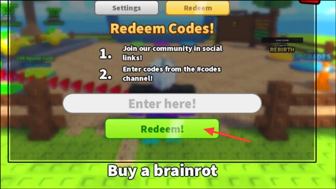 There is currently no in‑game menu to redeem codes in Don’t Wake the Brainrots. If the developers add a code system in a future update, expect a flow similar to the steps below in typical Roblox experiences.