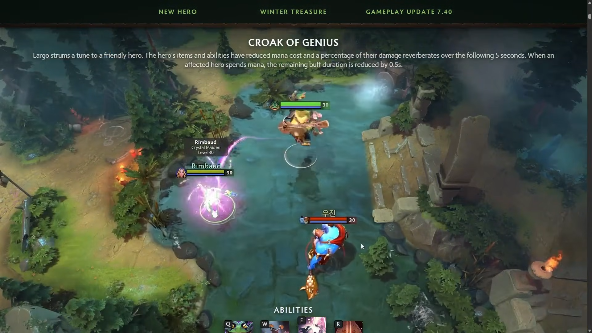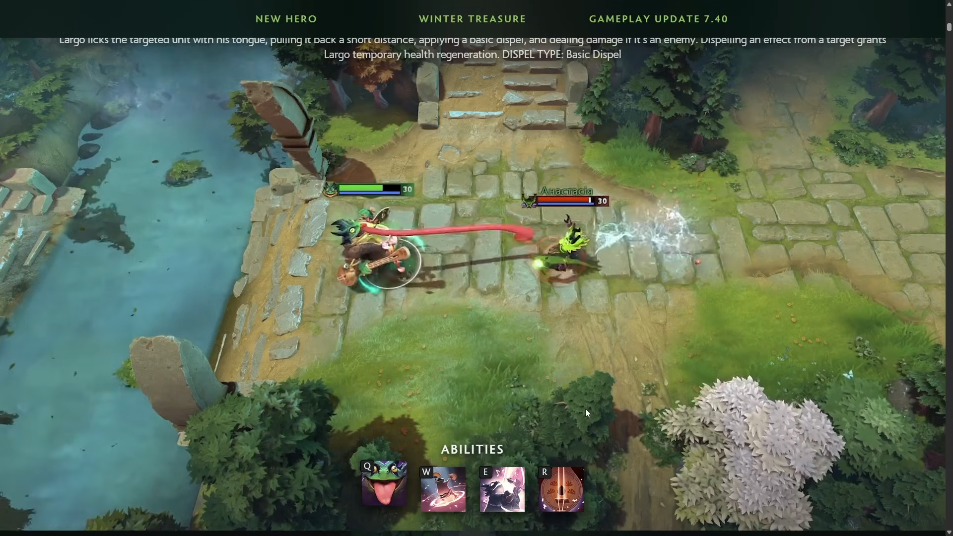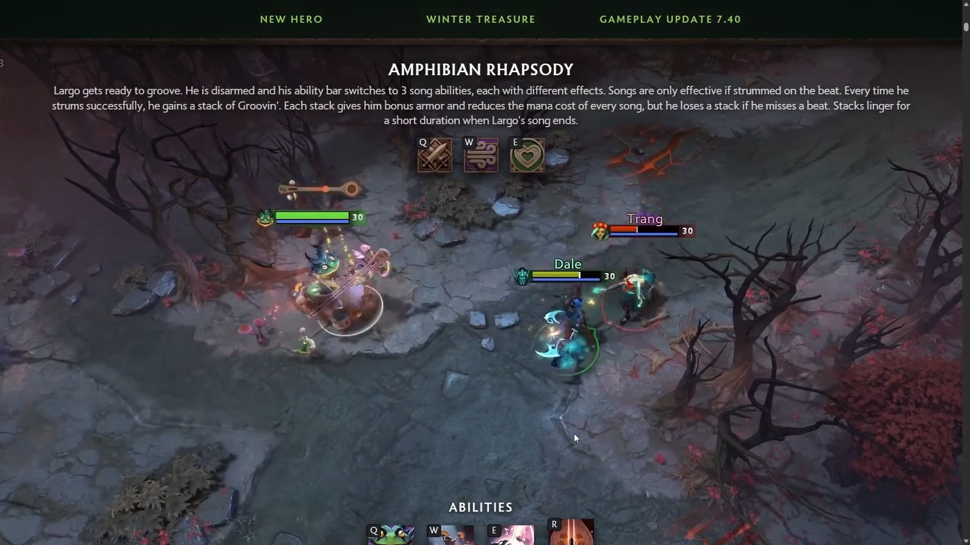 Amphibian Rhapsody, Largo’s ultimate, temporarily replaces his ability bar with three song abilities and disarms him. Each song has a distinct teamfight effect, but only works if you hit the rhythm prompts. Every successful strum gives a stack of Groovin’, which adds armor and reduces the mana cost of the songs. Missing a beat removes a stack, and stacks linger briefly after the performance ends, letting Largo carry some extra durability out of the channel.