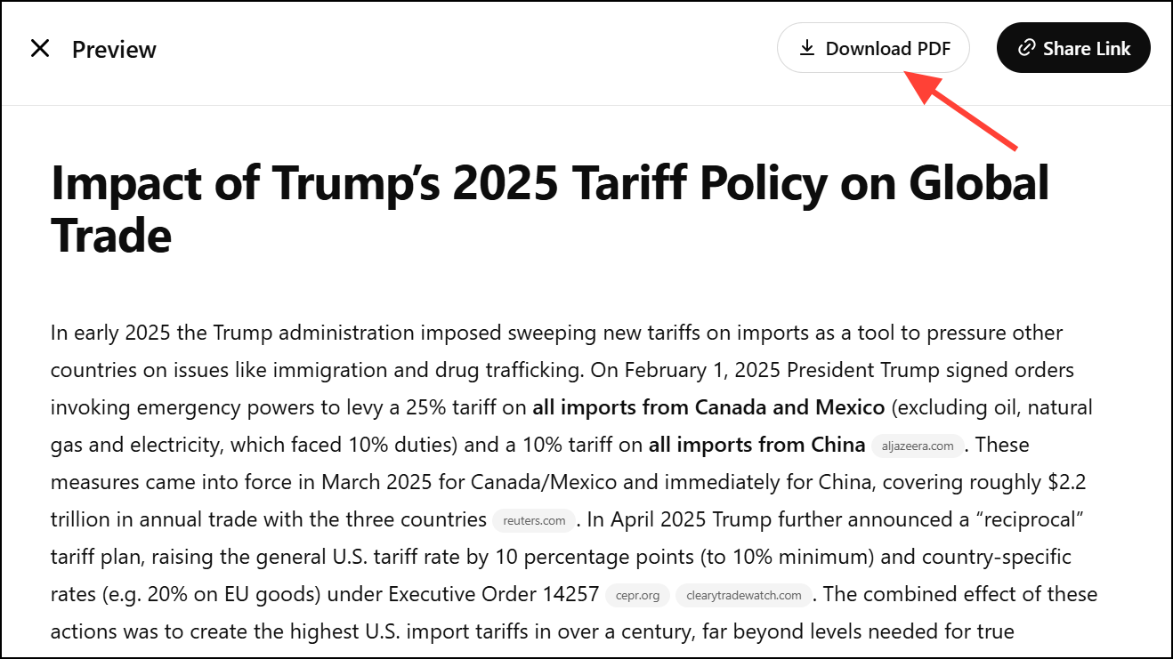 - Exported PDFs include clickable citations and links, making it easy to verify sources or share supporting evidence.