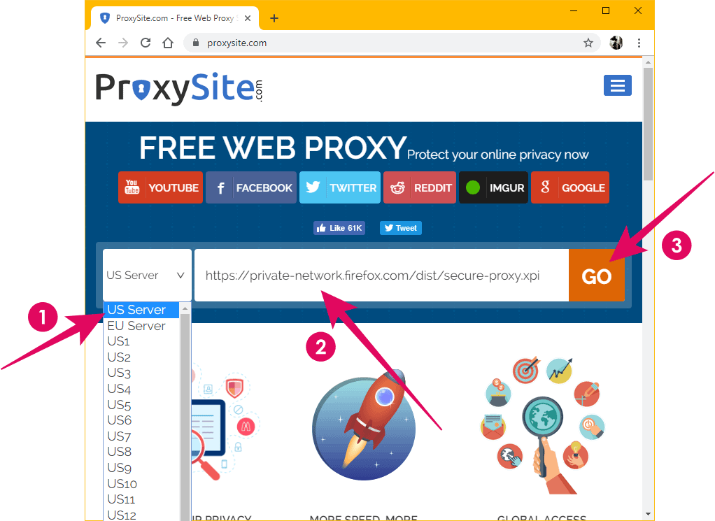 Open proxysite.com in Chrome on your PC. Select “US Server” from the dropdown menu, enter the URL https://private-network.firefox.com/dist/secure-proxy.xpi into the “Enter URL” box on proxysite.com and hit the “GO” button to download the extension.