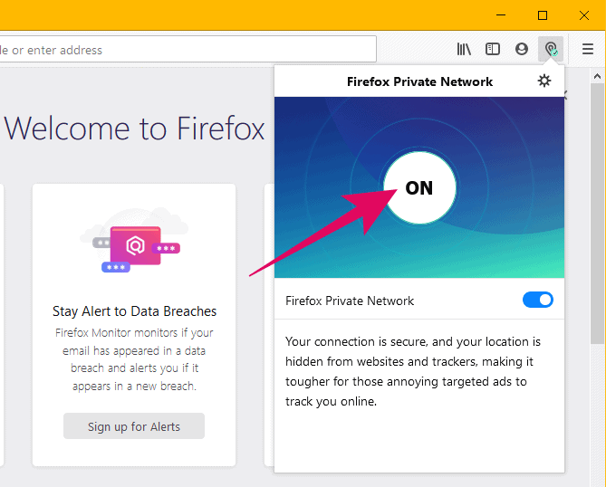 Once authenticated with your Firefox account, the Private Network will be enabled automatically in Firefox. You can verify its status by clicking the extension icon.