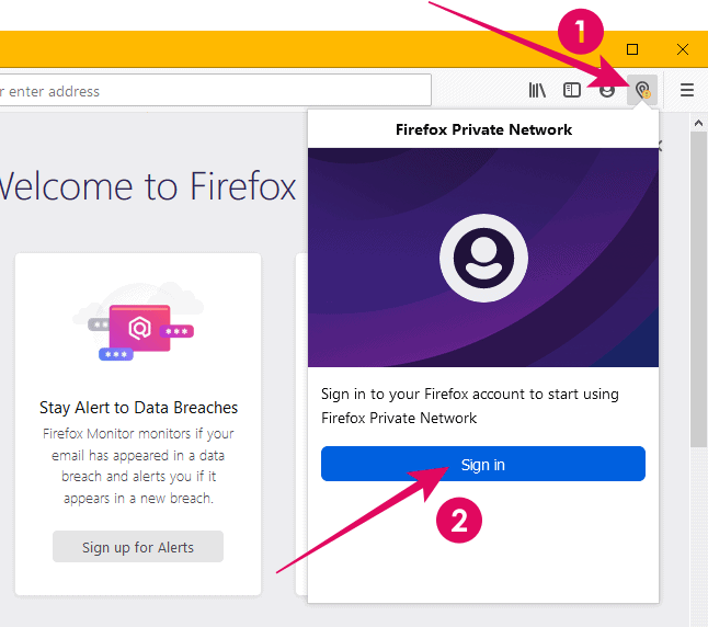 Now click the newly added “Firefox Private Network” extension icon in the toolbar, then click the “Sign in” button to authenticate the extension with your Firefox account.