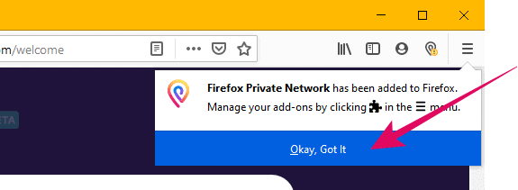 After installing the extension, Firefox will automatically open the private-network.firefox.com/welcome page. Ignore the page and the US customers only pop-up that it shows. Click “Okay, Got it” on confirmation pop-up for the newly installed extension.