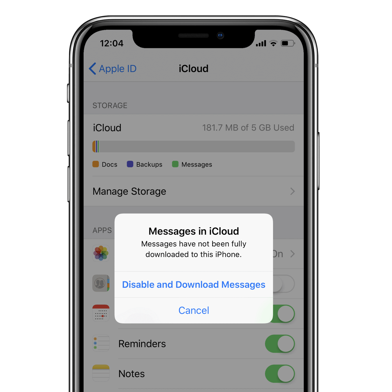- Select iCloud, and then turn Off the toggle for Messages.