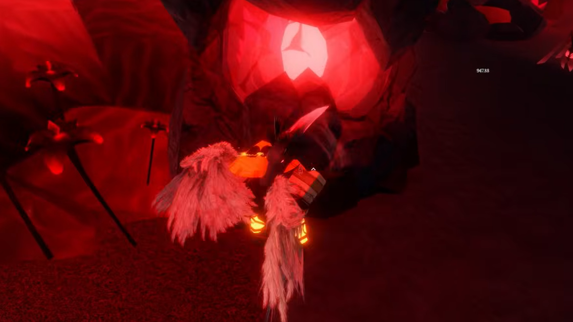 Step 2: Keep going until you reach a prominent glowing red orb or “heart” structure in the middle of the room. From that orb, turn right again toward a wall partially covered in red bushes and leaves.