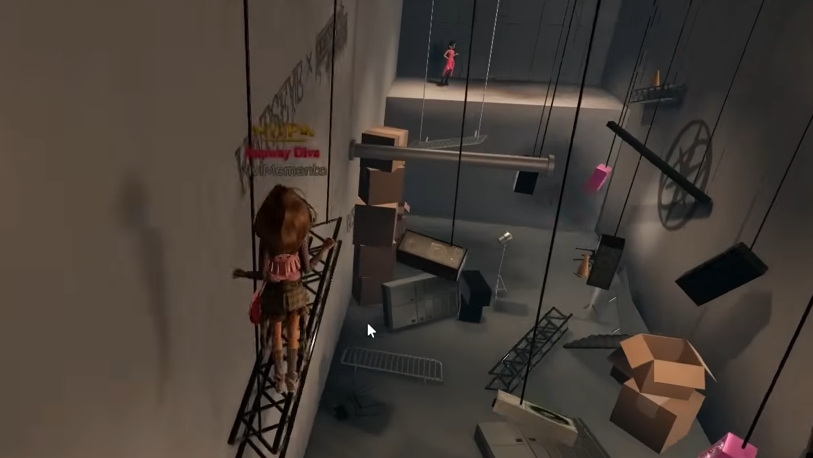 Step 3: Cross the parkour section by jumping across the boxes, pipes, and shelves suspended in the room. The course is short, and a ladder at the start lets you retry without going back upstairs if you fall.
