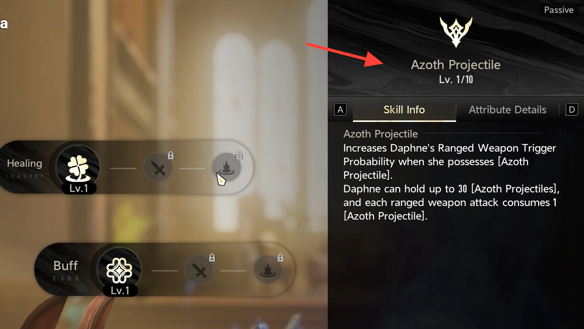 | Azoth Projectile | Passive — Ranged proc engine | When Daphne holds Azoth, her ranged weapon’s trigger probability is increased; each ranged attack consumes 1 Azoth. | Stores up to 30 Azoth; trigger probability bonus scales with level and can reach 100% at cap. |