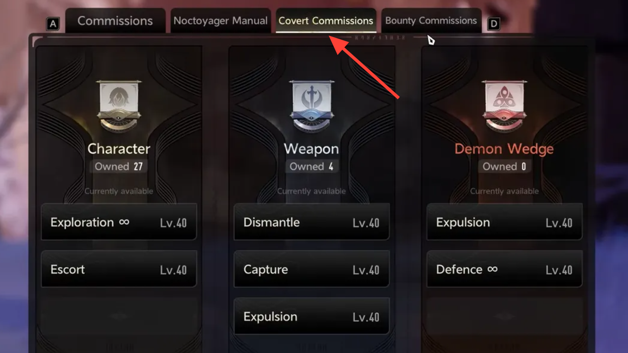 The most reliable farming path sits under Commissions → Noctoyager Manual in the Combat menu. These combat stages drop Character and Weapon wedges and scale by recommended level—the higher the stage, the better the rarity and effects you can see.