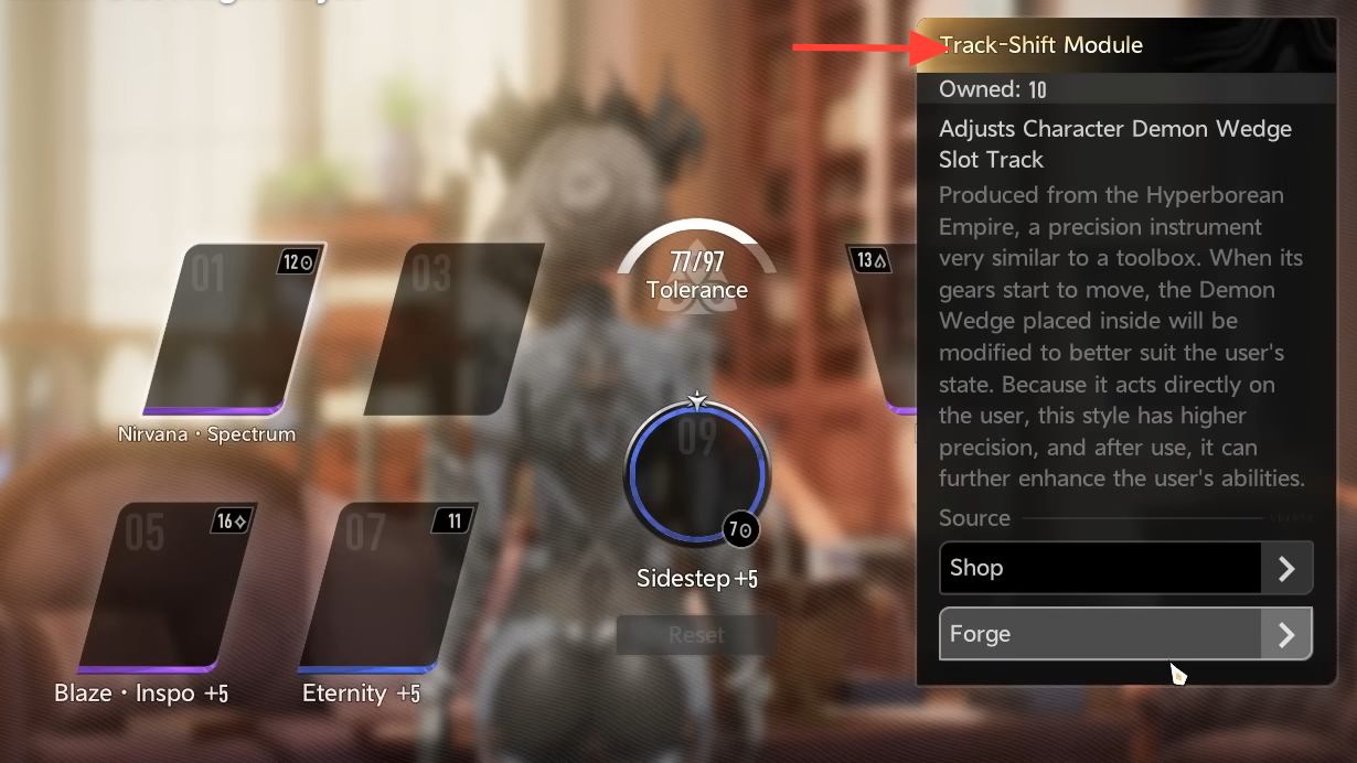 If your slots don’t line up with the wedges you need, Track‑Shift Modules let you change a slot’s Track. Character slots and weapon slots use different module types. You can get modules from the shop, by crafting them at the Lunosmith after obtaining a blueprint, and by leveling characters and weapons.