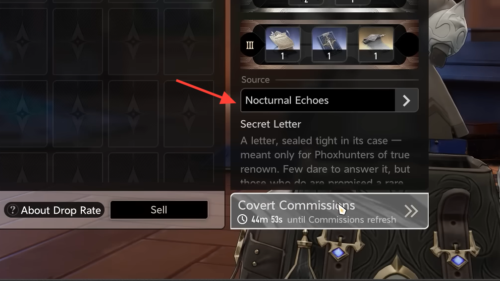 Covert Commissions come in three types — Character, Weapon, and Demon Wedge — and rotate hourly. You pick a Secret Letter, complete the mission, and then choose one of three items from that Letter’s loot pool.