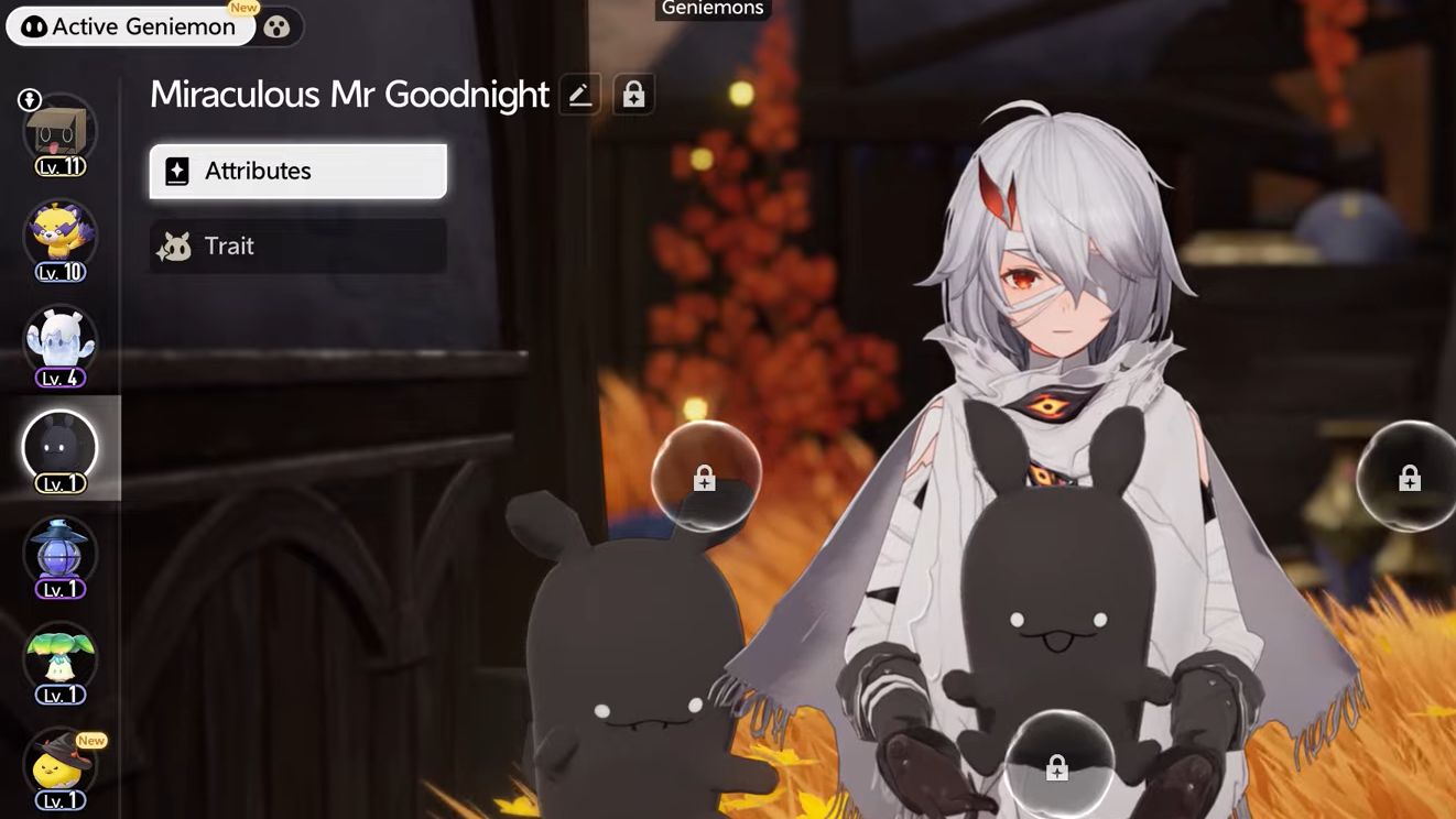 Mr Goodnight doesn’t align with any element, so you can slot it into any team without worrying about elemental synergy. It is flagged as an active Geniemon, meaning you can call on its support skill in combat rather than treating it as a purely passive stat stick.