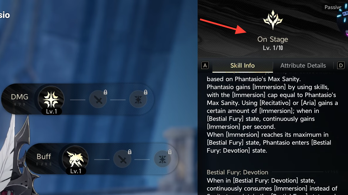 In Bestial Fury, Phantasio’s Attack increases based on his Max Sanity. Using Recitativo/Aria and maintaining Bestial Fury generates Immersion up to a cap equal to Max Sanity. When Immersion reaches its cap during Bestial Fury, he shifts into Bestial Fury: Devotion, which drains Immersion instead of Sanity to sustain the form and further boosts movement, skill speed, and Attack (still scaling off Max Sanity).