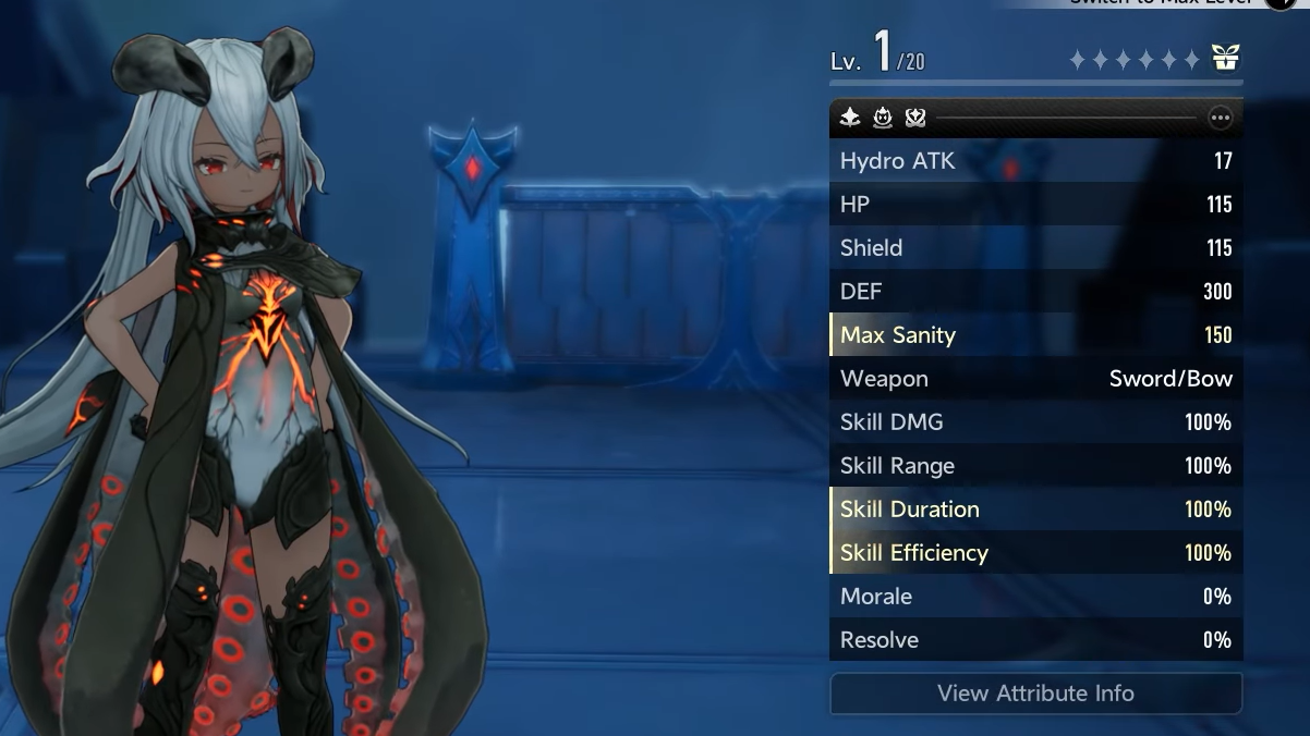 | Base stats (Lv.1 → ~Lv.80) | ATK 17 → ~320 • HP 115 → ~1444 • Shield 115 → ~1444 • DEF 300 • Max Sanity 150 |