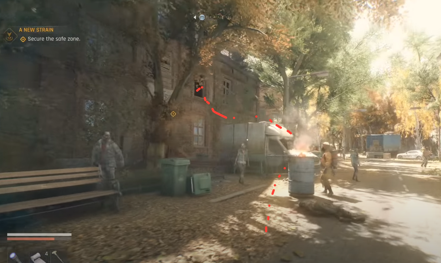 Travel to the memorial site — you can attempt it at night for bonus XP, but enemies hit harder and punish mistakes. The plaza is thick with infected; prioritize Spitters first (one on a nearby truck, another perched on the monument) before you get pinned by splash damage. Use environmental tools to thin the horde: Molotovs and red gas canisters detonate clusters quickly.