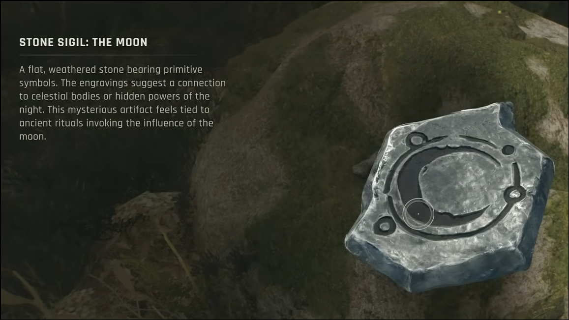 Head further east to a clearing with several standing stone slabs. Enter the small walled nook on the left side of the site, turn around, and collect the sigil from the center slab.