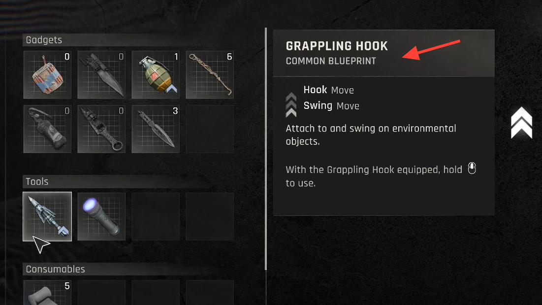 Step 1: Equip the grappling hook in Kyle’s tools slot via the inventory screen. This makes it available on the weapon/tool wheel for quick access.