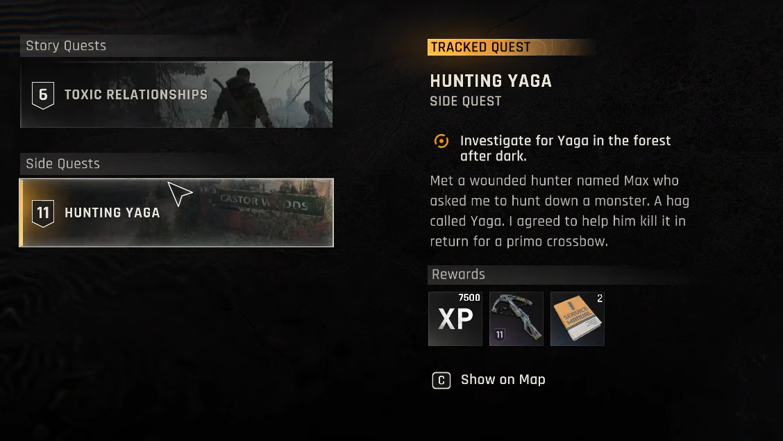 Completing the chain grants Max’s hunting crossbow at the end of the mission, turning the errand into one of the most valuable late‑game detours. The first leg must be done at night, where gunfire can attract Volatiles; after you secure the Yaga’s Trophy, shifting to daytime for the human firefights makes the rest of the quest far more manageable.