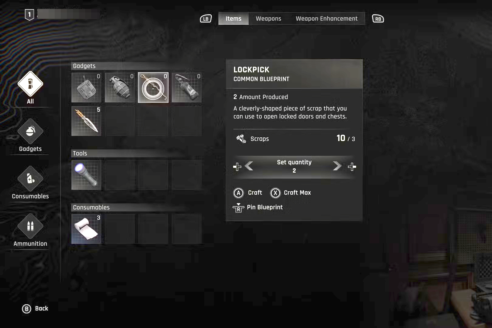 Step 1: Open the crafting menu. Find the Lockpick under the Gadgets category. You can also use a workbench if you’re already at one, but it isn’t required.