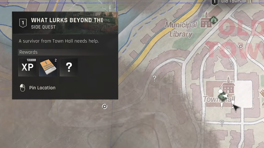 After you complete the main story mission “The Beast Within,” head to the Town Hall safe zone in Old Town. In the meeting room, speak with Eli (standing by a map) to accept “What Lurks Beyond the Pines.” Your first lead points to his family cabin in the National Park.