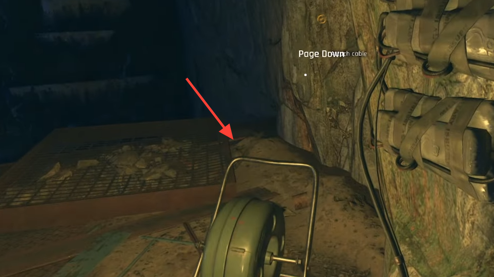 Grab the first cable spool near William. Traverse the metal and rocky platforms hugging the cavern wall directly across from the overlook. Attach the cable to the first charge.
