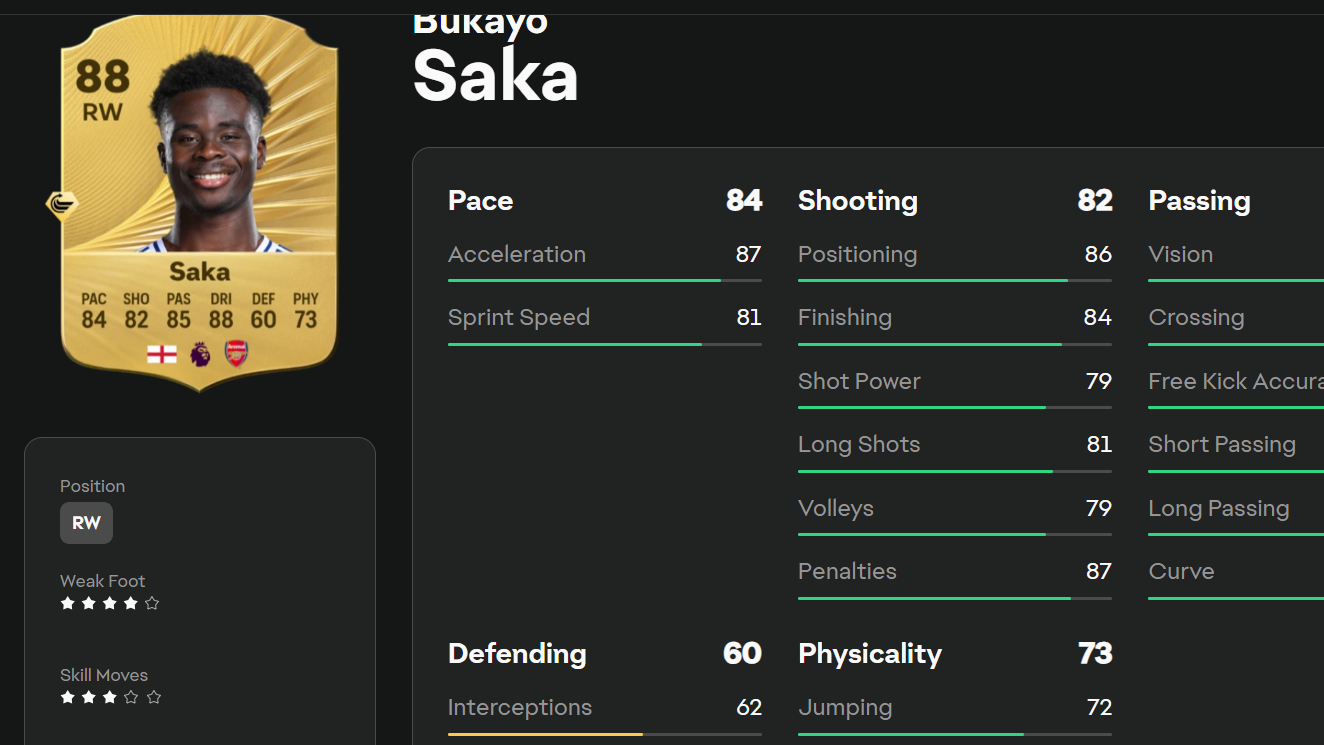 Bukayo Saka (Whipped Pass+, RW/RM, 88 OVR)