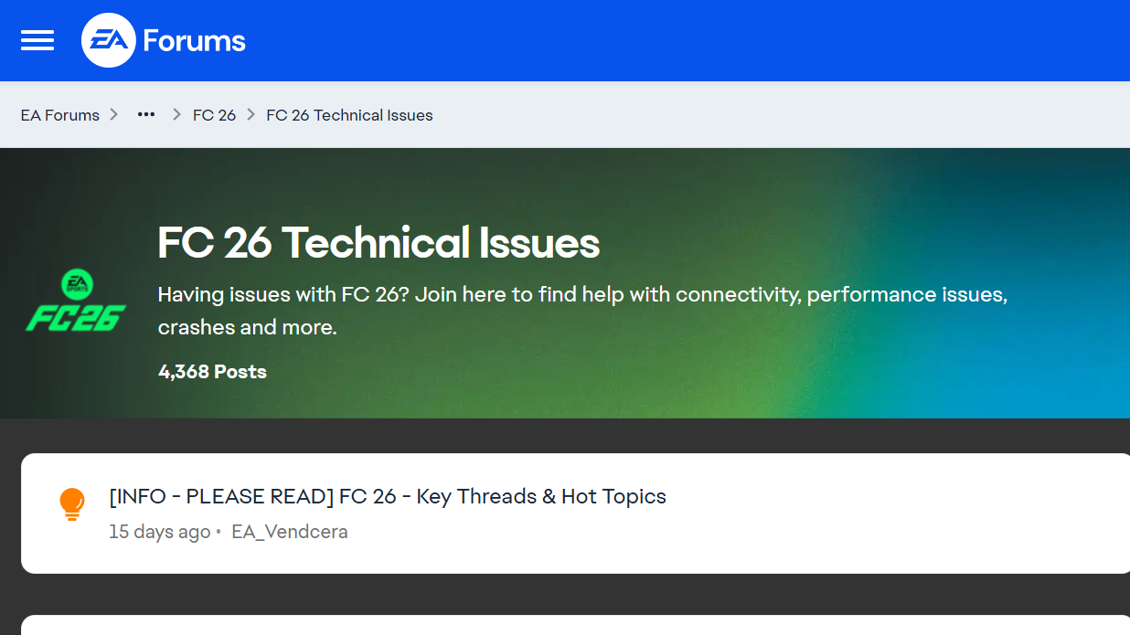 If you need a place to surface reproducible Clubs access issues to support staff, use the FC 26 Technical Issues forum on the EA site at forums.ea.com/category/fc-26-en/discussions/fc-26-technical-issues-en.