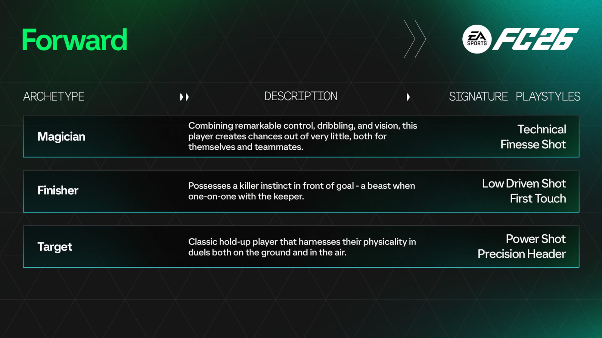 Archetypes are FC 26’s new player classes for Clubs. You pick one on your first entry into Clubs, then unlock the remaining 12 with Clubs Coins, FC Points, or an Archetype Unlock item earned as a reward. Each of the 13 archetypes has unique minimum/maximum attribute ranges, four lower-cost Key Attributes, Signature PlayStyles that upgrade to PlayStyle+, and a visual Archetype Card that evolves from Bronze to ICON as you level.