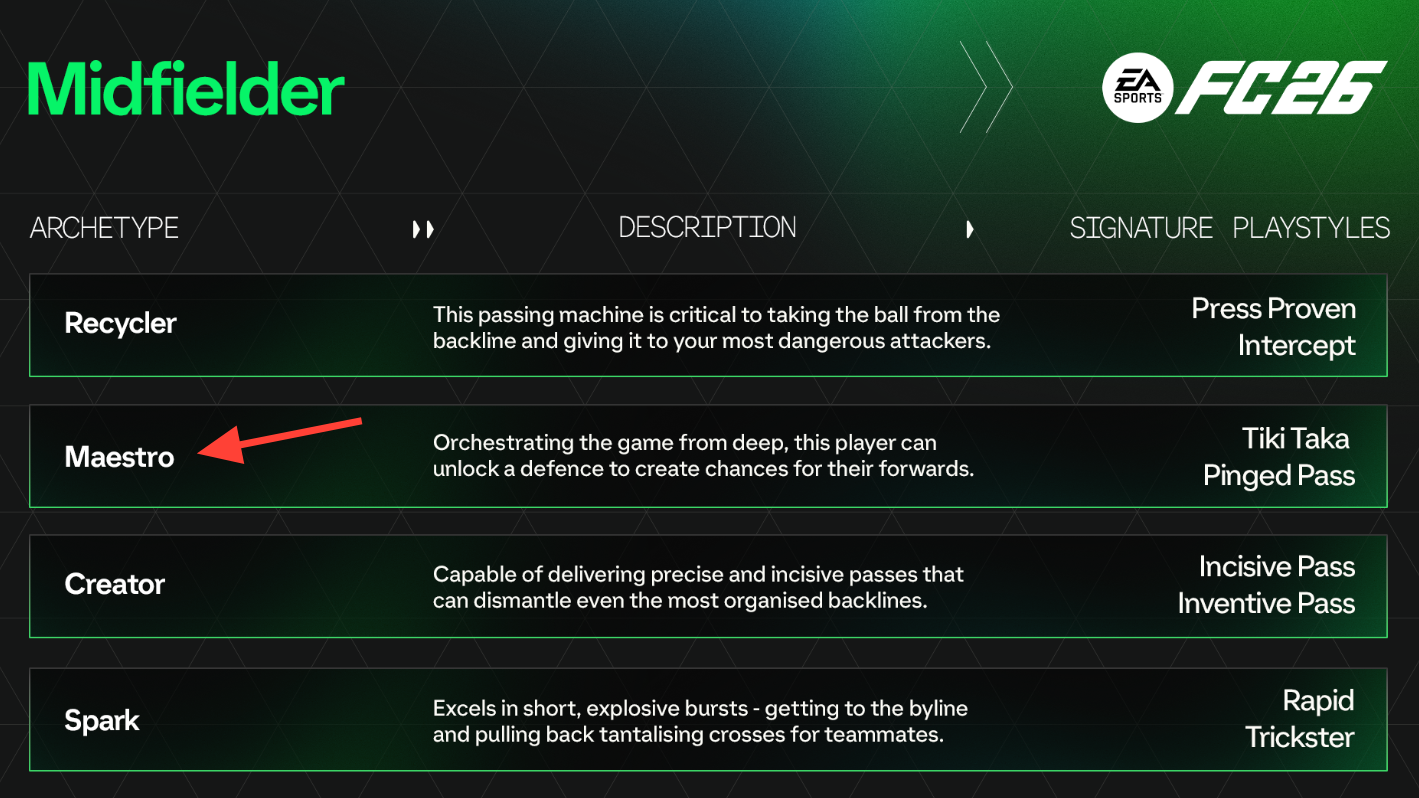 In Clubs, your central midfielder is the metronome and the pressure valve. The most reliable way to run a match is a balanced profile built on clean distribution, secure touches, and just enough steel to win the ball back. The Maestro archetype checks every box for an all‑phase CM, with a playstyle package that rewards quick combinations and progressive passing without leaving you exposed in transition.
