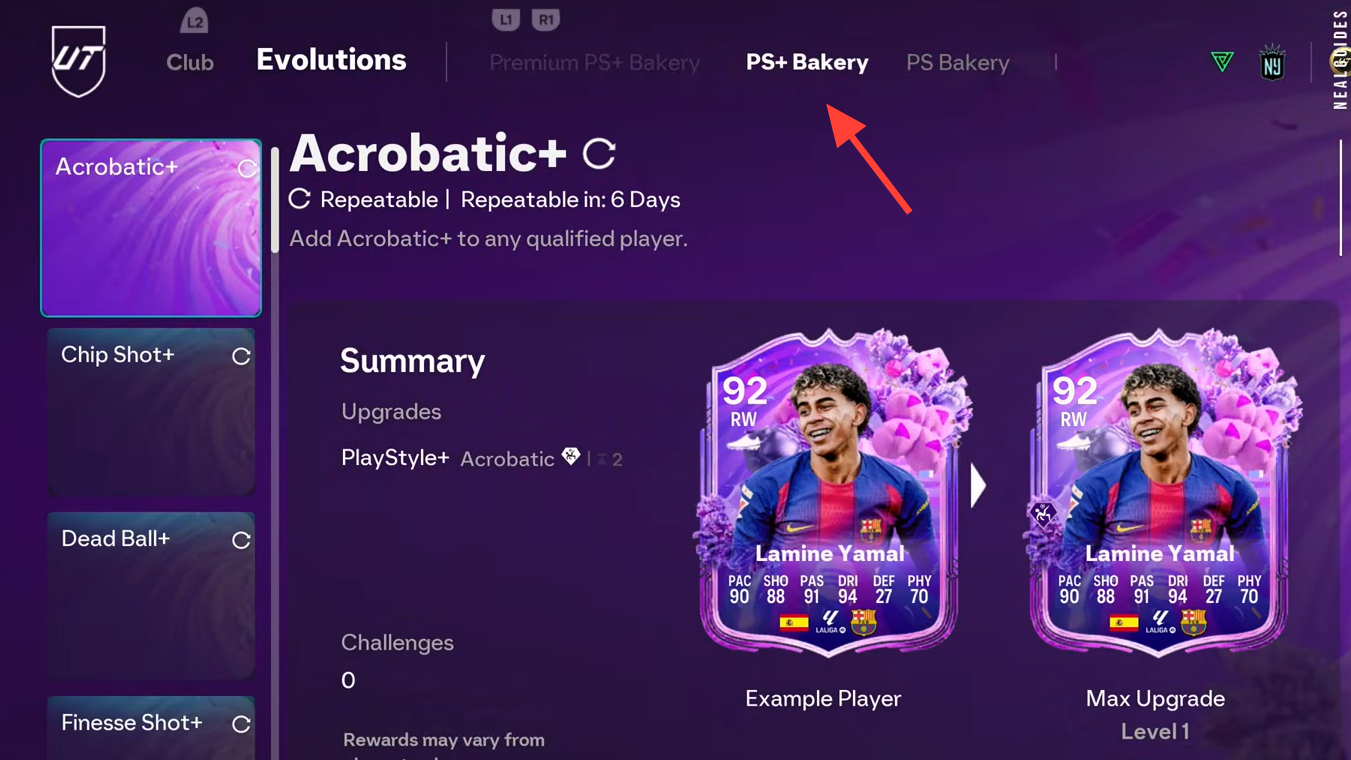 Step 4: Move to the PlayStyle+ Bakery when you want premium traits. You can add up to two PlayStyle+, either through the free tab if the cooldown is available or through the Premium tab if you want to pay coins or FC Points.