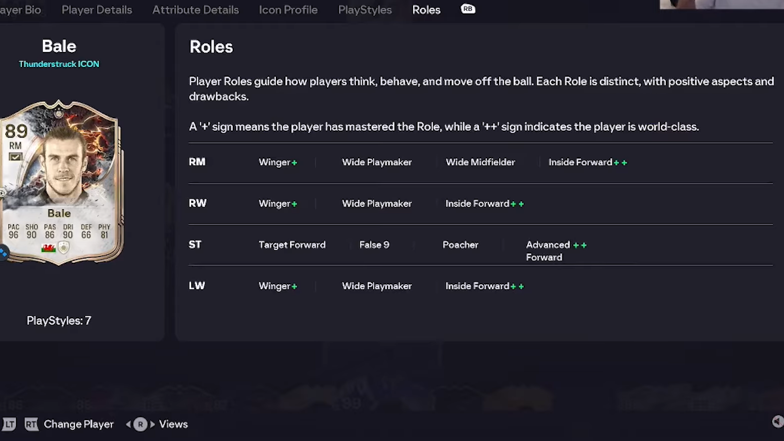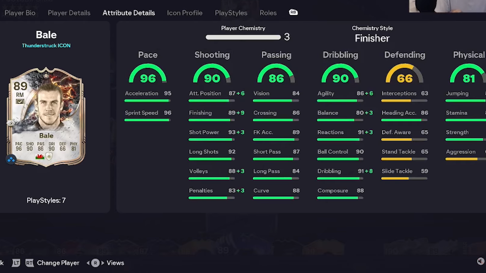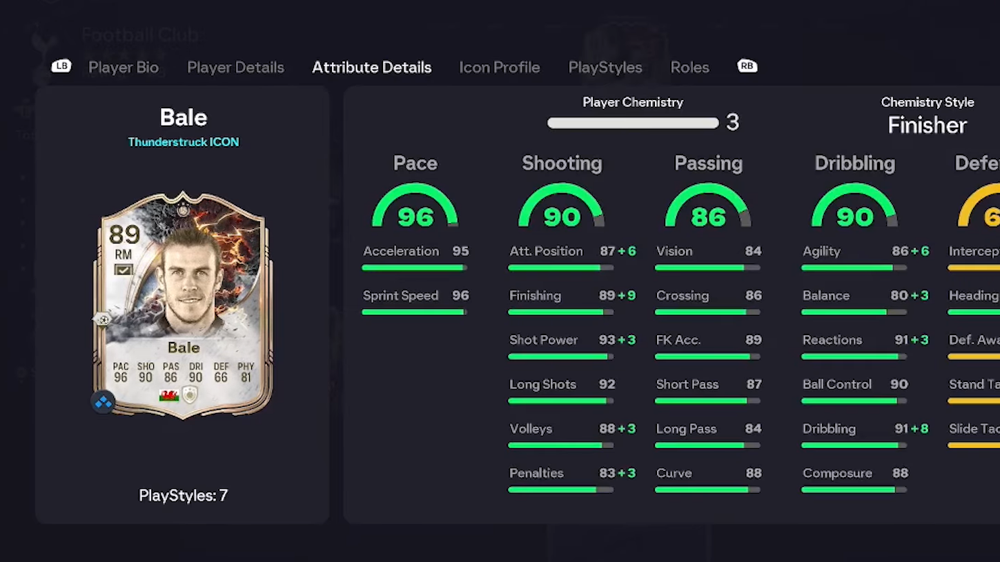In the current meta, that combination of 95 pace with high shooting and dribbling makes Bale a top-tier wide forward who can also play centrally as a goal scorer. He sits in the EA FC Icons league and the Wales nation pool, which simplifies chemistry links compared to regular club cards.