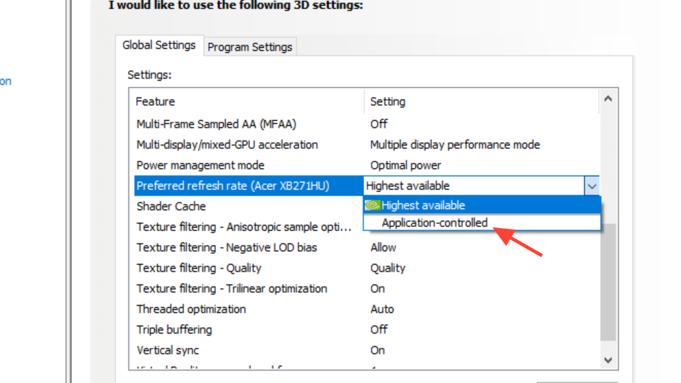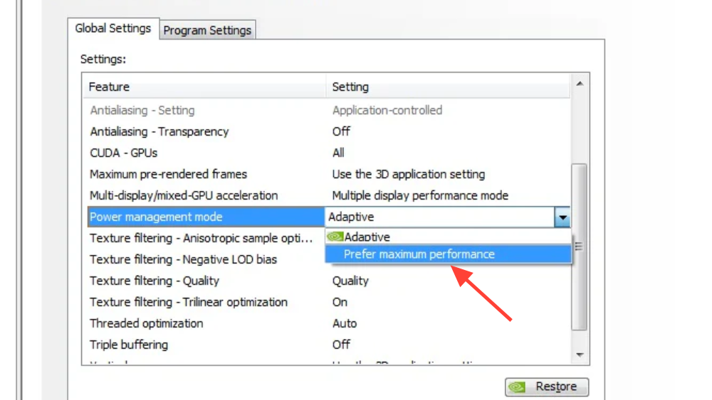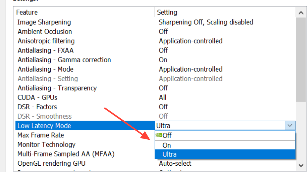 - Nvidia only: Low Latency Mode Ultra/On; Power management Maximum Performance.