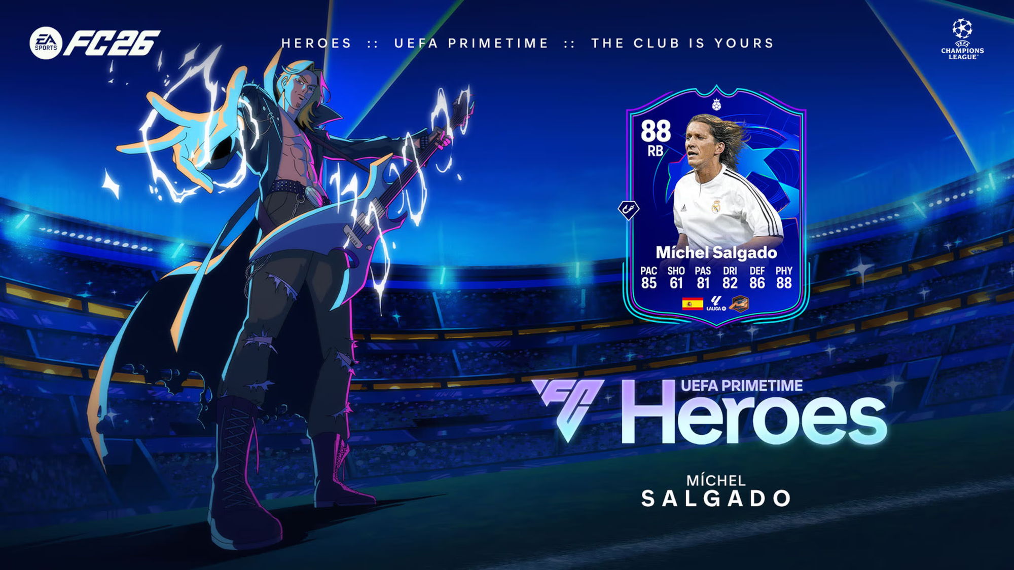 New UEFA Primetime Heroes in FC 26 include Simone Laudehr (CM, 89 OVR), Daniele De Rossi (CDM, 88 OVR), and Míchel Salgado (RB, 88 OVR).