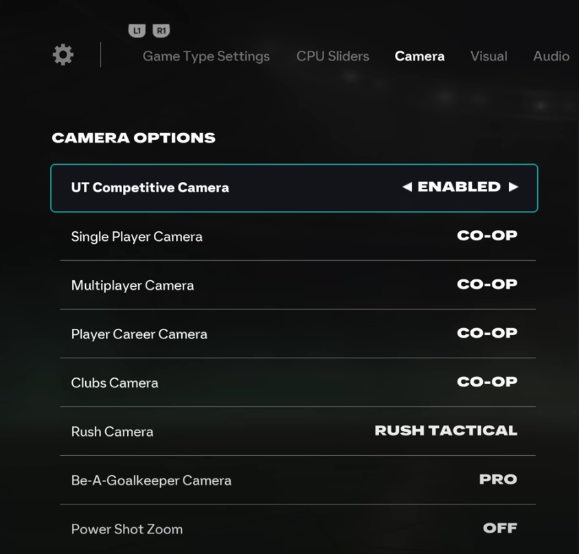 Note: In specific Ultimate Team “UT Competitive” playlists, the game can enforce a dedicated competitive camera. In other UT and online modes, you can choose freely.