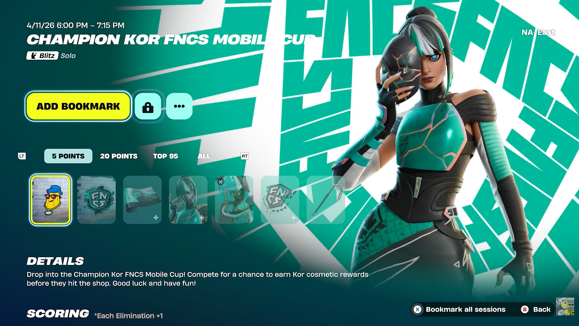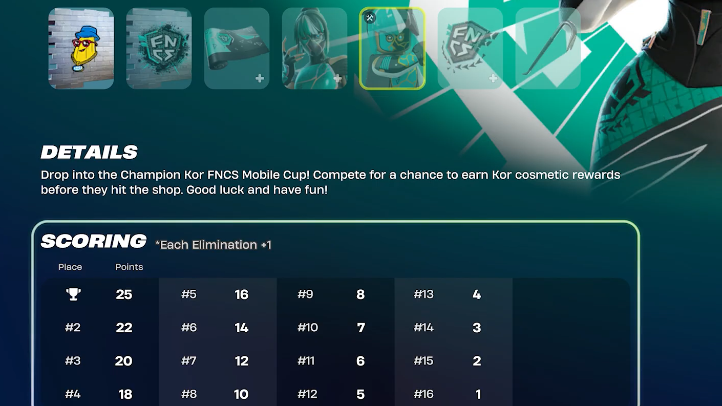 Mobile players have their own separate tournament running the same day. The Champion Kor FNCS Mobile Cup is a Solo competition played in Blitz mode, and the reward pool is identical to the BR Duos cup. The key difference is that far fewer players per region will qualify for the skin.